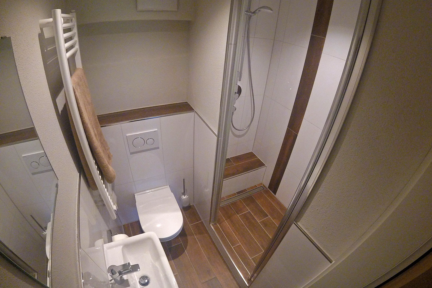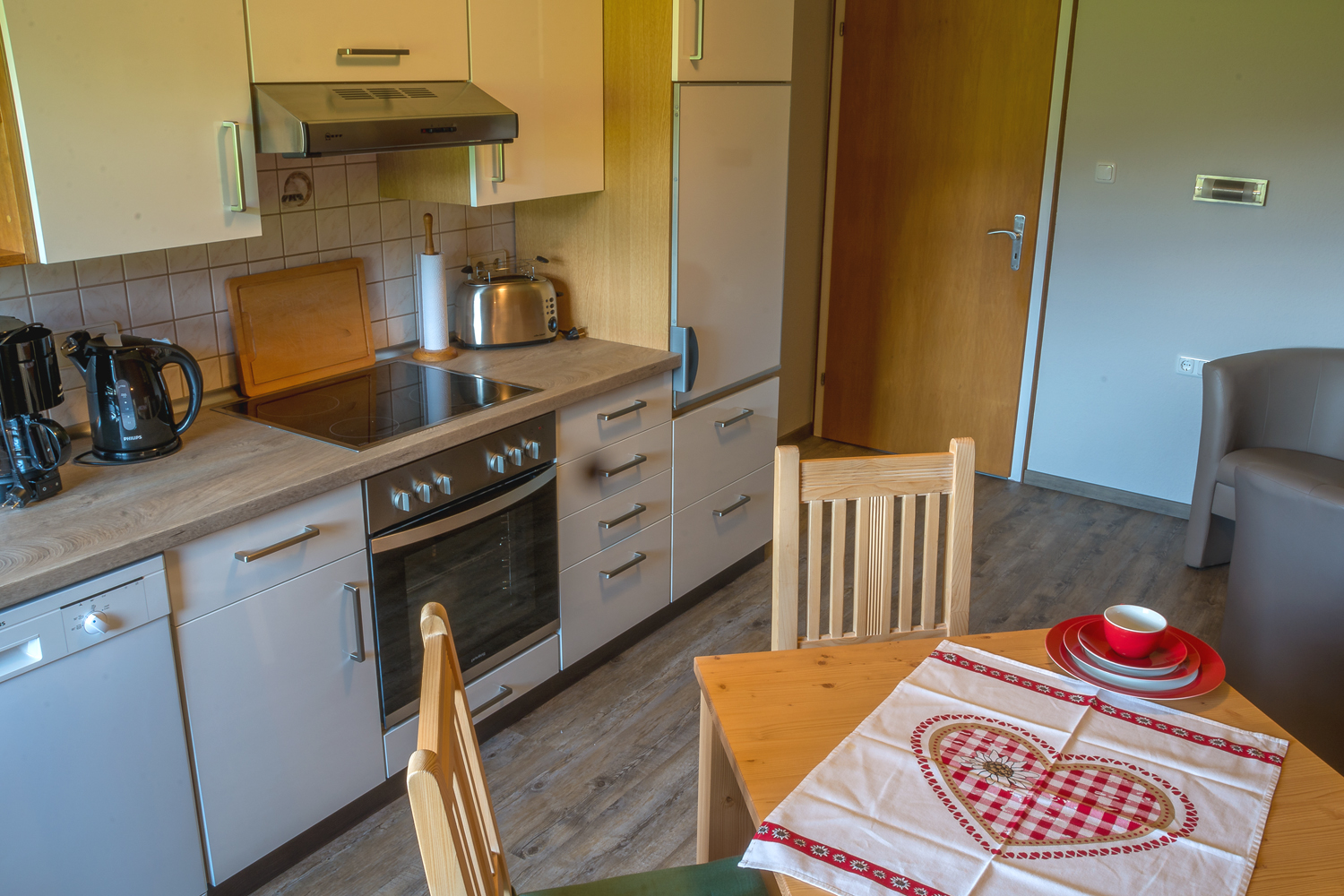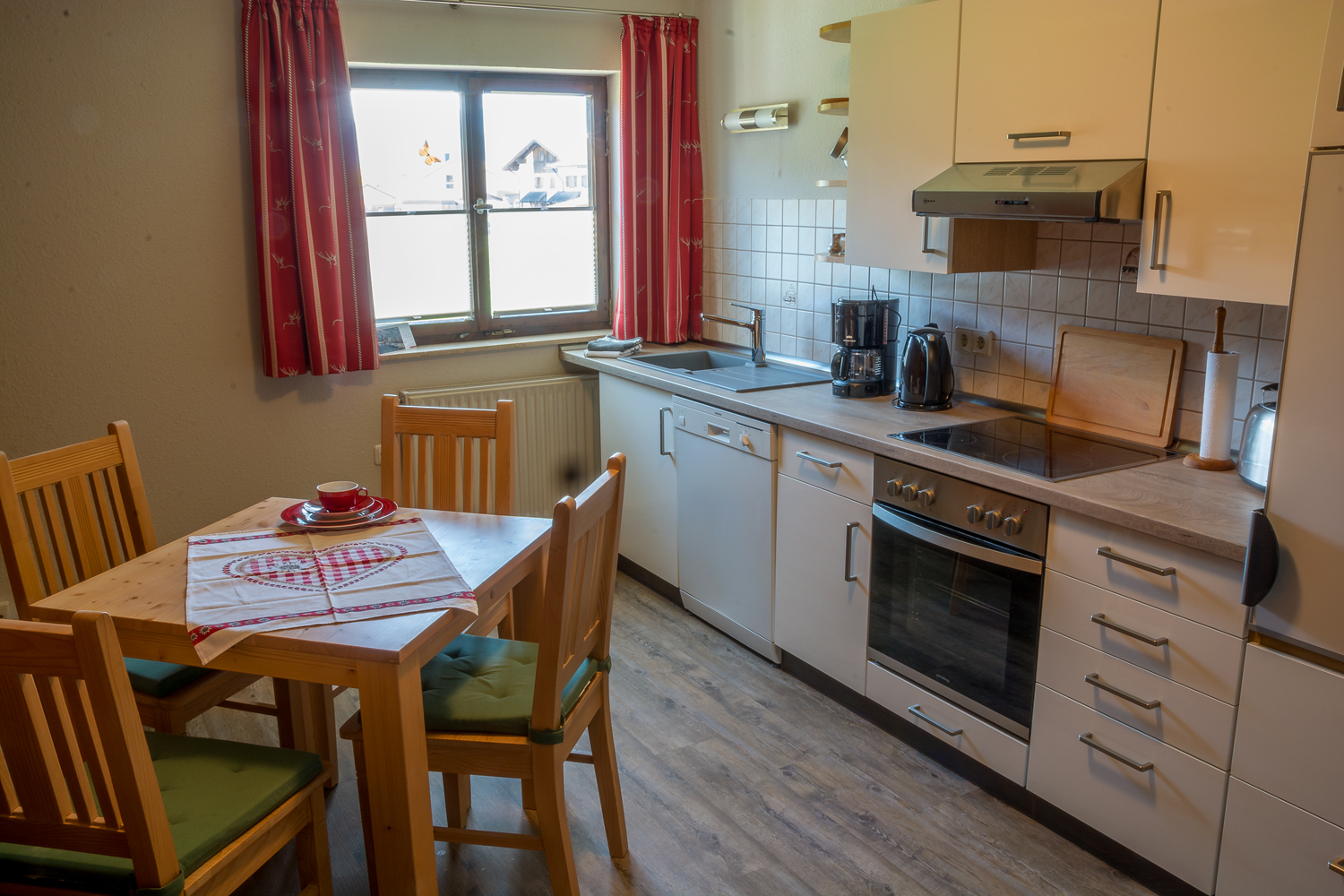 Wie unsere Zimmer, ist die für vier Personen ausgestattete Nichtraucher Ferienwohnung Oberjochpass, ebenfalls in gemütlich - warmer Farbgestaltung, modern und zeitlos mit alpenländischen Vollholzmöbeln eingerichtet. In beiden Schlafzimmern ist ein großer, in das Wohnumfeld eingebundener Waschtisch sowie ein TV-Gerät vorhanden. Das Bad wird von der großzügigen Dusche dominiert. Die für vier Personen ausgestattete Küche verfügt über einen Herd, Spülmaschine, Kühlschrank, Mikrowelle, Wasser- und Eierkocher. Selbstverständlich empfangen wir Sie auch gerne zum Frühstück in unserem Café 47° oder auf unserer Panoramaterrasse.